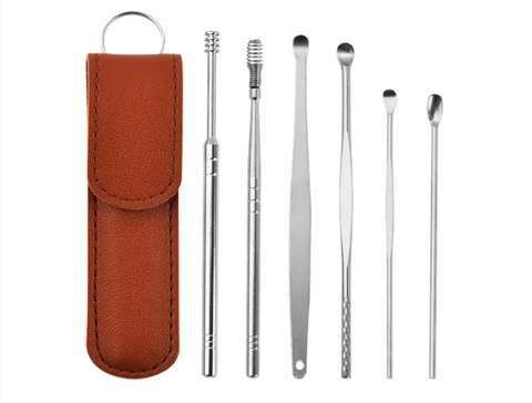 1 x 6 Piece Stainless Steel Ear Pick Set with Leather Packaging
